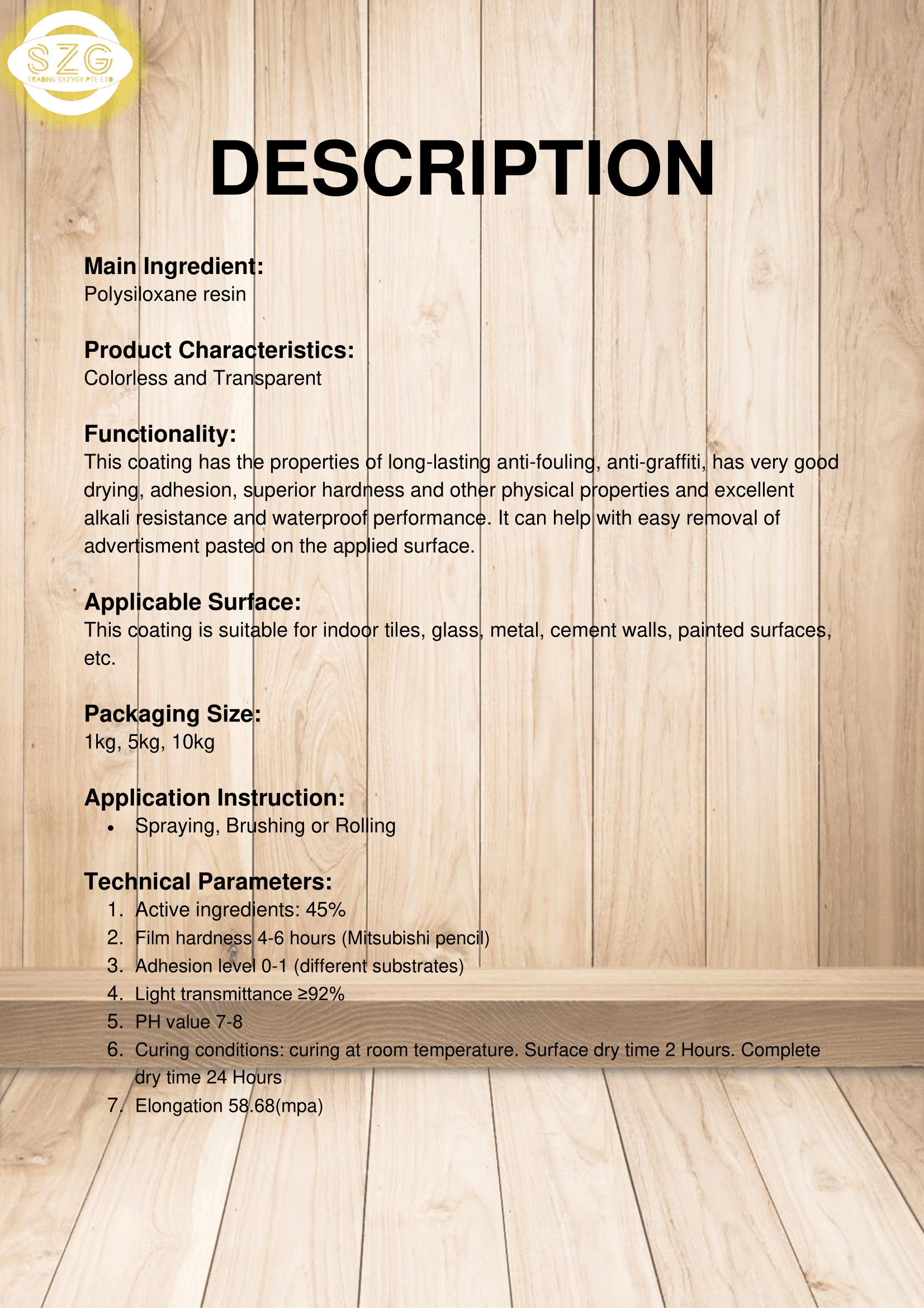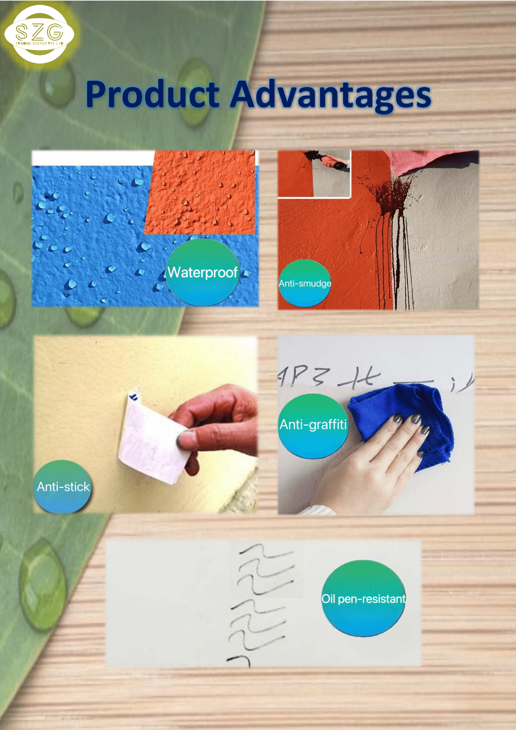 This coating has the properties of long-lasting anti-fouling, anti-graffiti, has very good drying, adhesion, superior hardness and other physical properties and excellent alkali resistance and waterproof performance. It can help with easy removal of advertisment pasted on the applied surface.