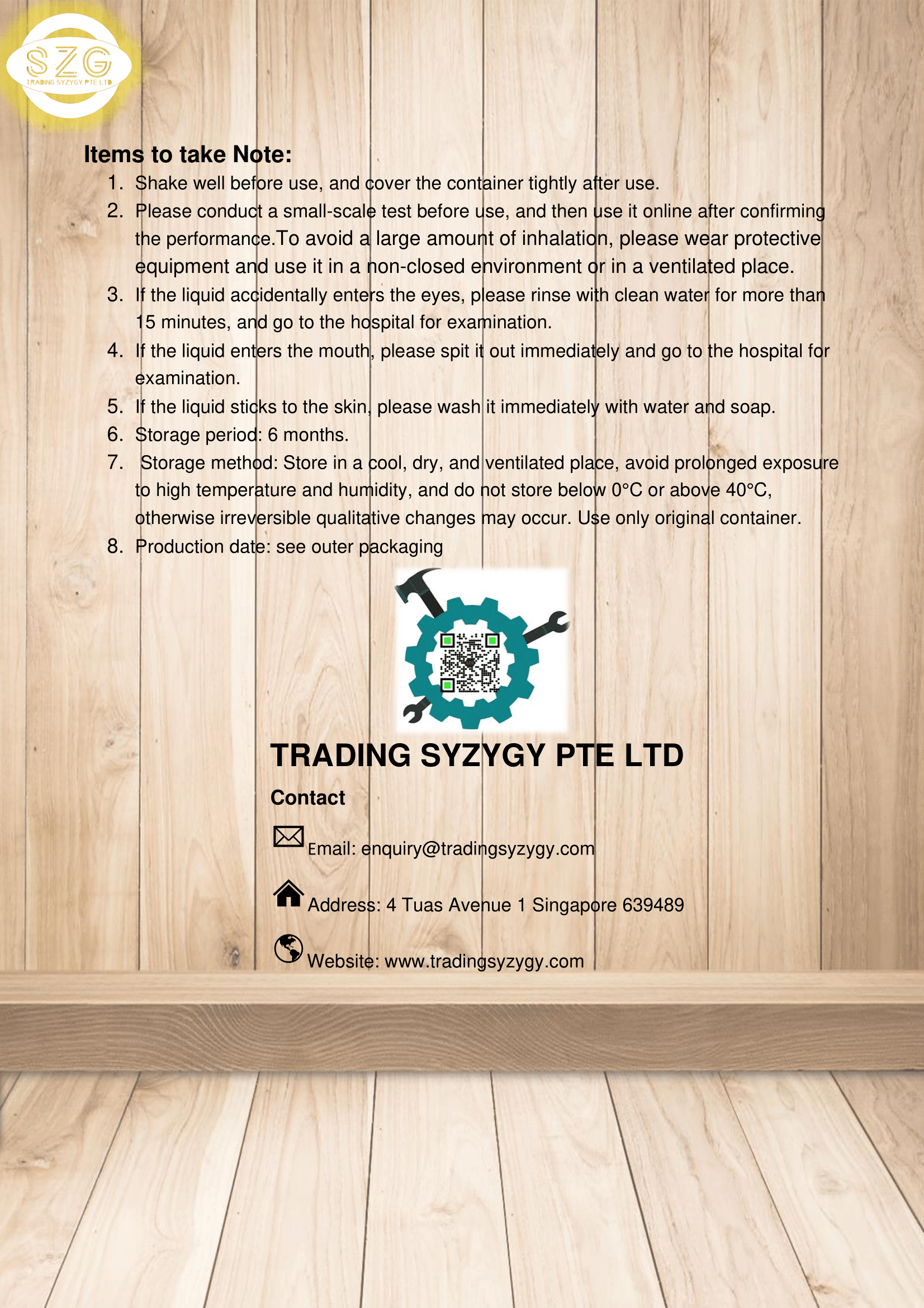 - Please conduct a small-scale test before use, and then use it online after confirming the performance.To avoid a large amount of inhalation, please wear protective equipment and use it in a non-closed environment or in a ventilated place.