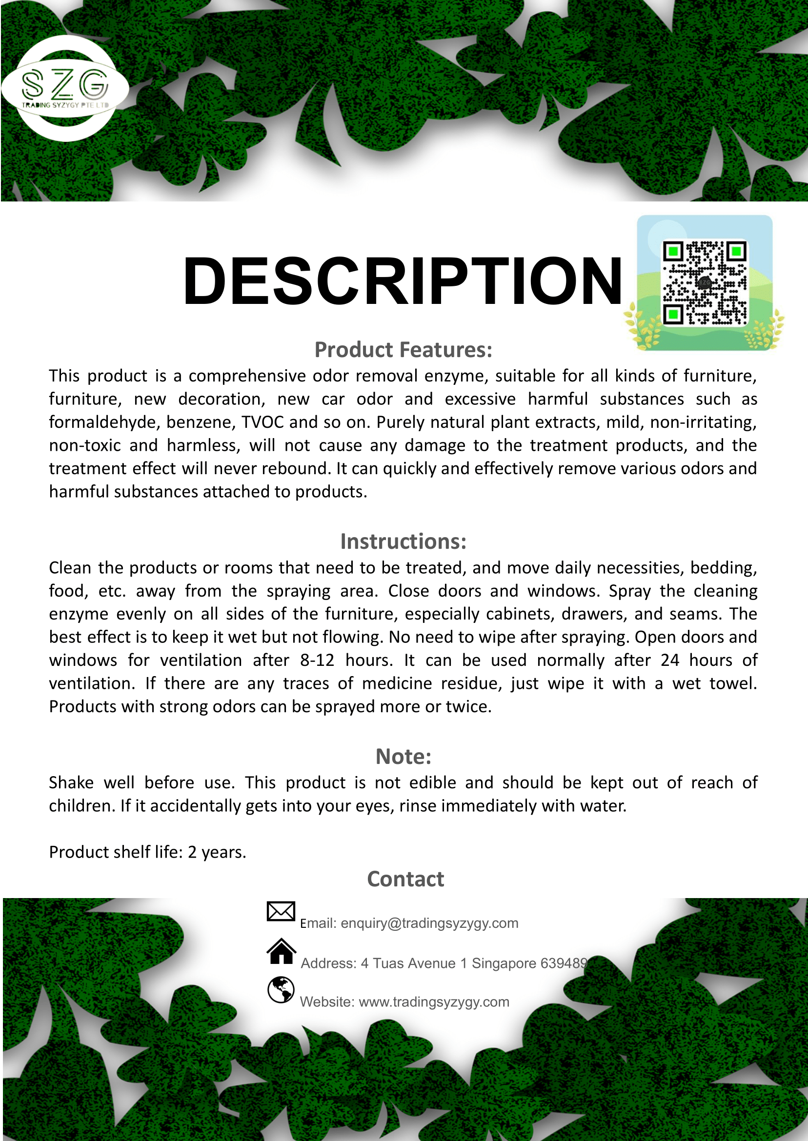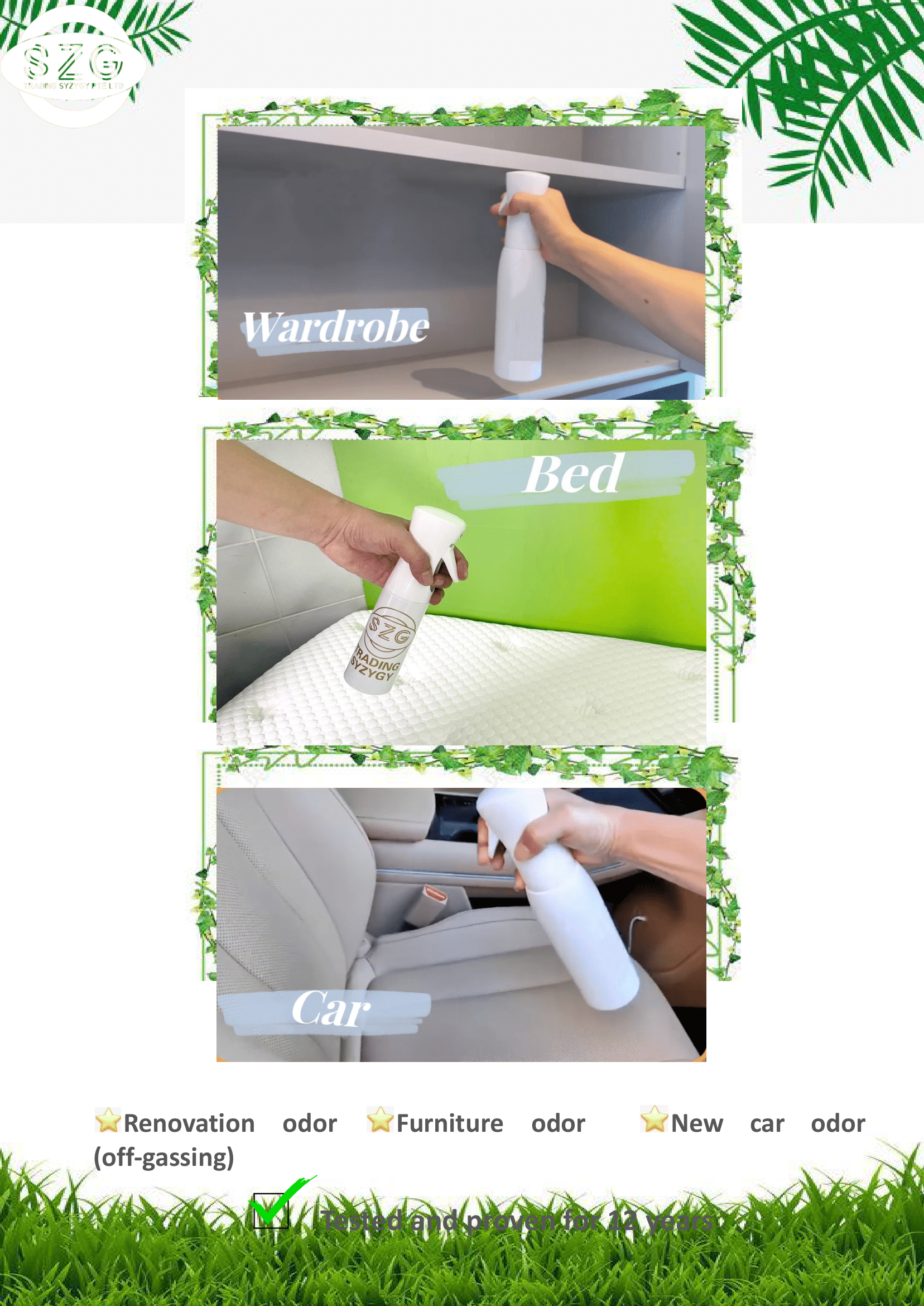 This product is a comprehensive odor removal enzyme, suitable for all kinds of furniture, furniture, new decoration, new car odor and excessive harmful substances such as formaldehyde, benzene, TVOC and so on. Purely natural plant extracts, mild, non-irritating, non-toxic and harmless, will not cause any damage to the treatment products, and the treatment effect will never rebound. It can quickly and effectively remove various odors and harmful substances attached to products.