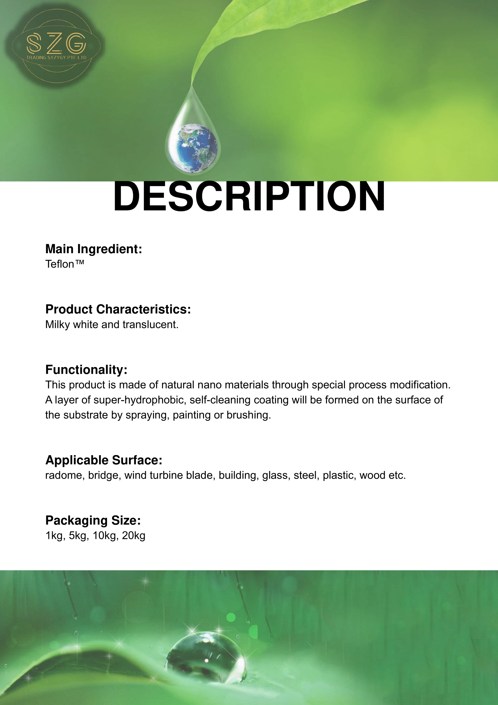 This product is made of natural nano materials through special process modification. A layer of super-hydrophobic, self-cleaning coating will be formed on the surface of the substrate by spraying, painting or brushing.