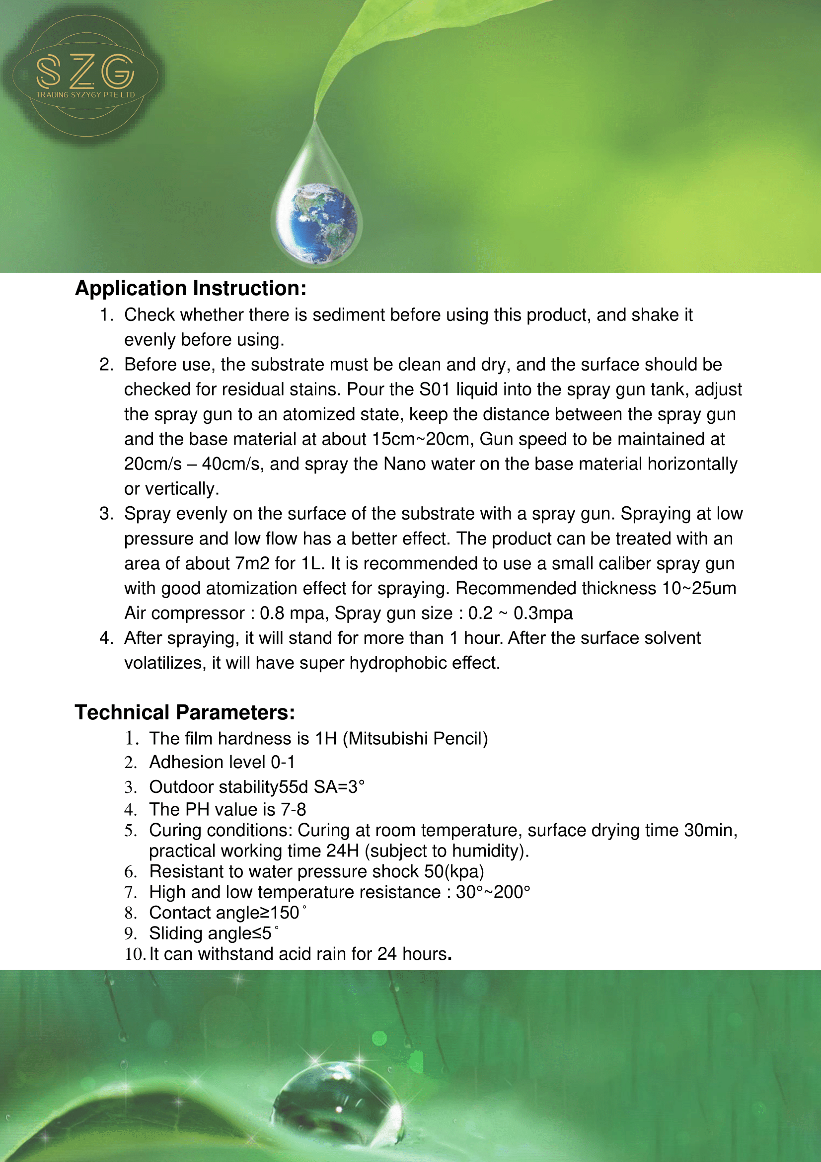 - Before use, the substrate must be clean and dry, and the surface should be checked for residual stains. Pour the S01 liquid into the spray gun tank, adjust the spray gun to an atomized state, keep the distance between the spray gun and the base material at about 15cm~20cm, Gun speed to be maintained at 20cm/s – 40cm/s, and spray the Nano water on the base material horizontally or vertically.